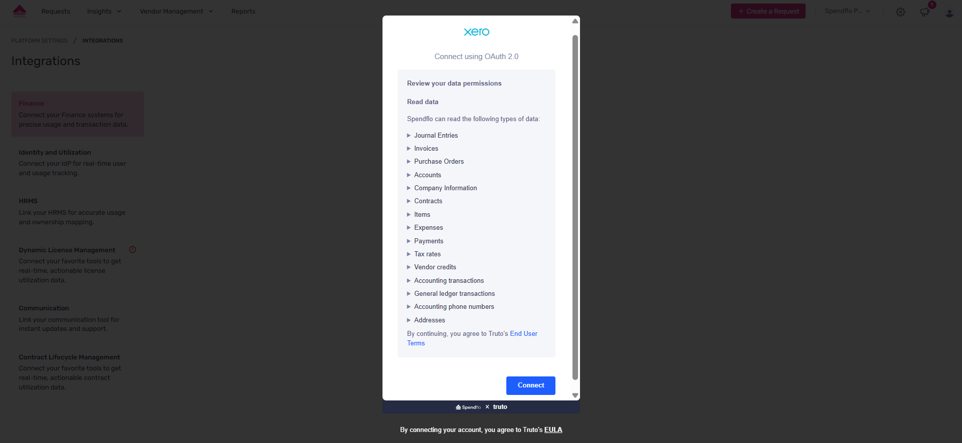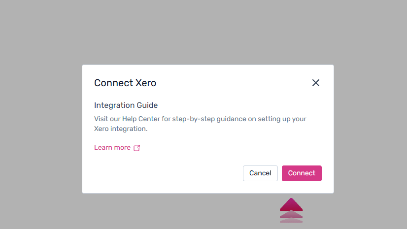 Step 2. Open the dropdown under Integrations → Finance and select the Xero integration. A modal containing the help documentation will appear—click Connect to initiate the integration