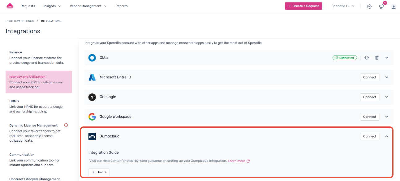 Head to Settings > Platform Settings > Integrations > Identity and Utilization, and click the Connect button under JumpCloud Integration.