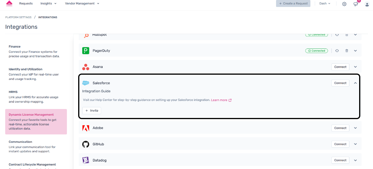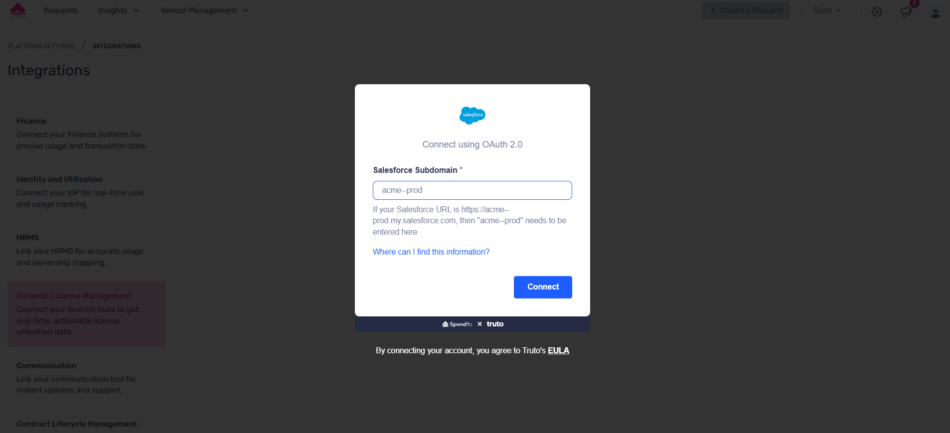 Once you locate the Salesforce app under integrations > Dynamic License Management, click on connect; this will open a separate window.
