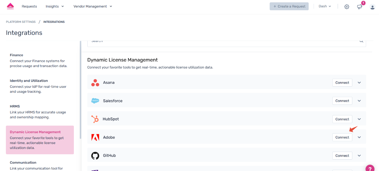 First, navigate to the Spendflo integrations page from Settings > Platform Settings > Integrations > Dynamic License Management. Then locate the Adobe app from the app list and click connect