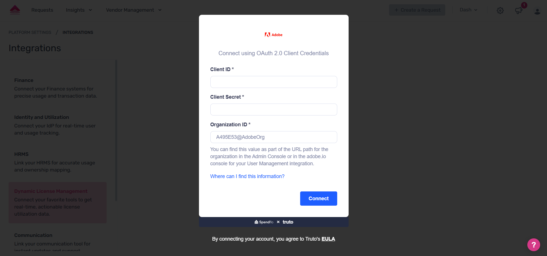 Paste the Client ID, Client Secret and Organization ID that you copied from Adobe to Spendflo integration page. And Voila! you're done.