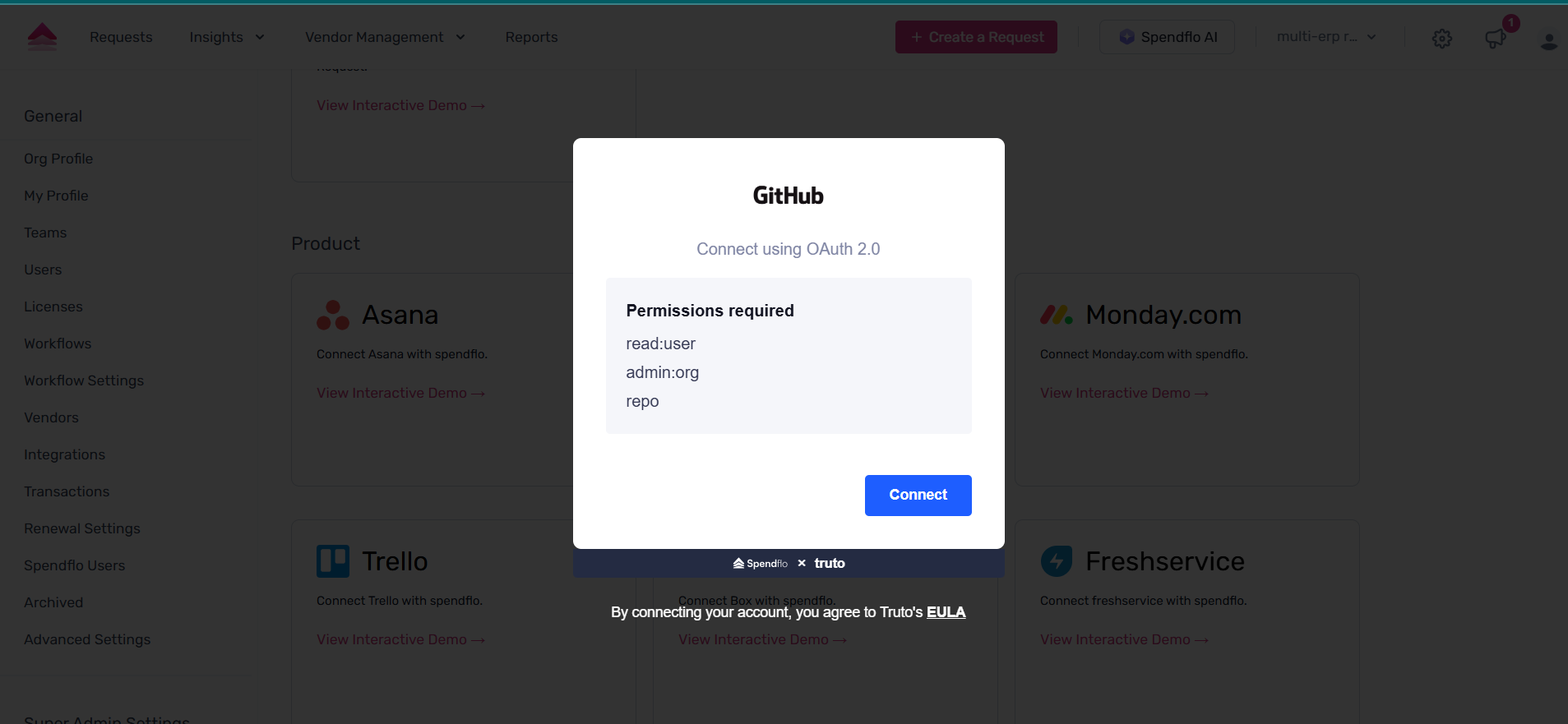 First, navigate to the Spendflo integrations page from Settings>Management Hub>Integrations>Available Apps. Then locate the GitHub app from the app list and click connect