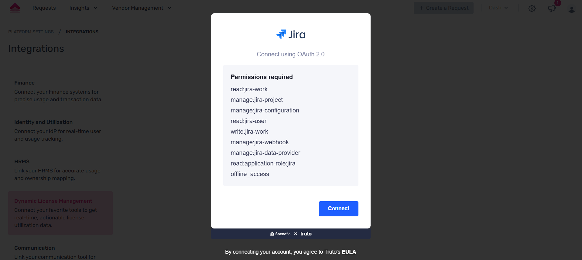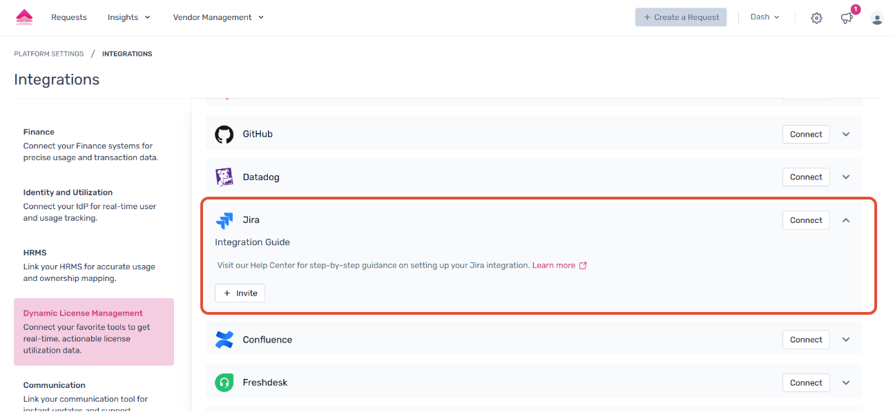 2. Navigate to Jira under Dynamic License Management and click Connect; ensure you are logged in to your Jira account. If an admin is required to connect, open the accordion and click Invite to invite an admin to complete the connection.