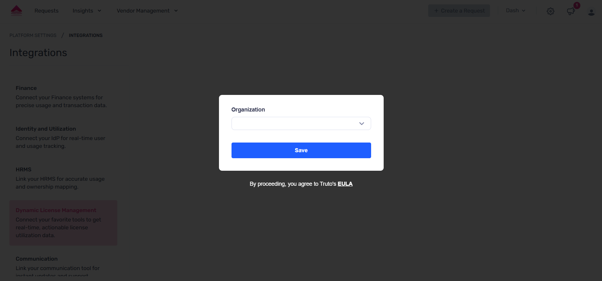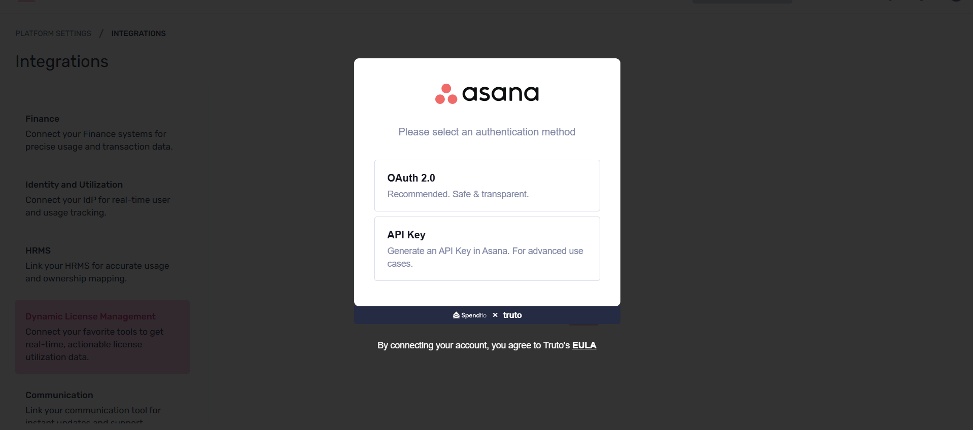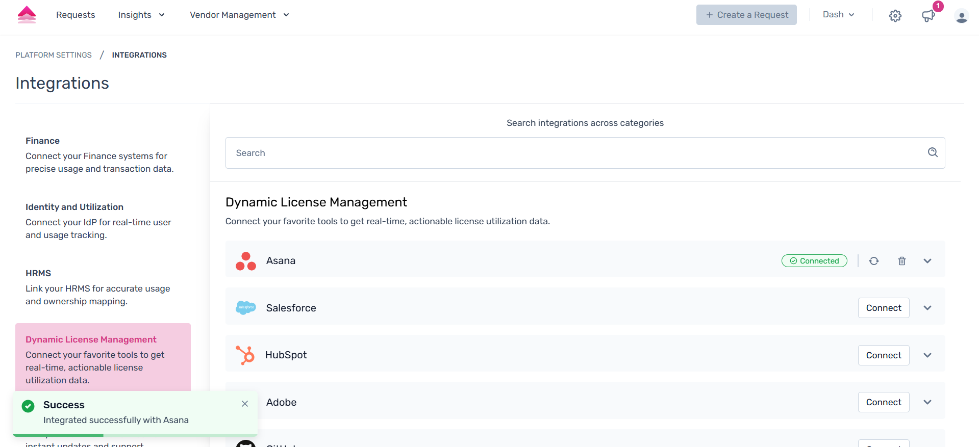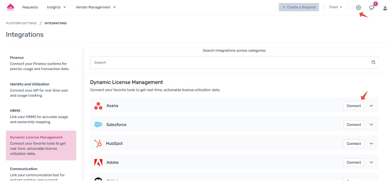 To access the Asana integration, go to Settings → Platform Settings → Integrations, and under Dynamic License Management, select Asana.