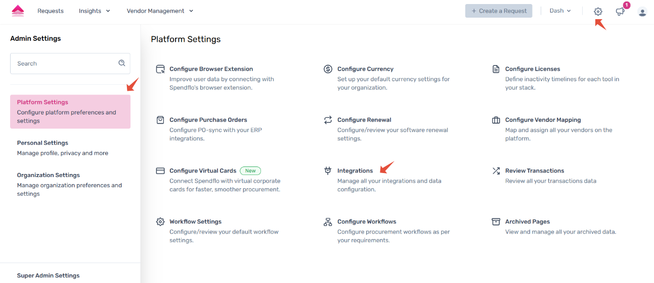 1. Go to app.spendflo.com & click on Settings -> Platform Settings -> Integrations