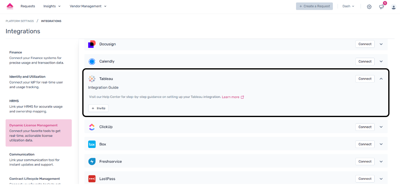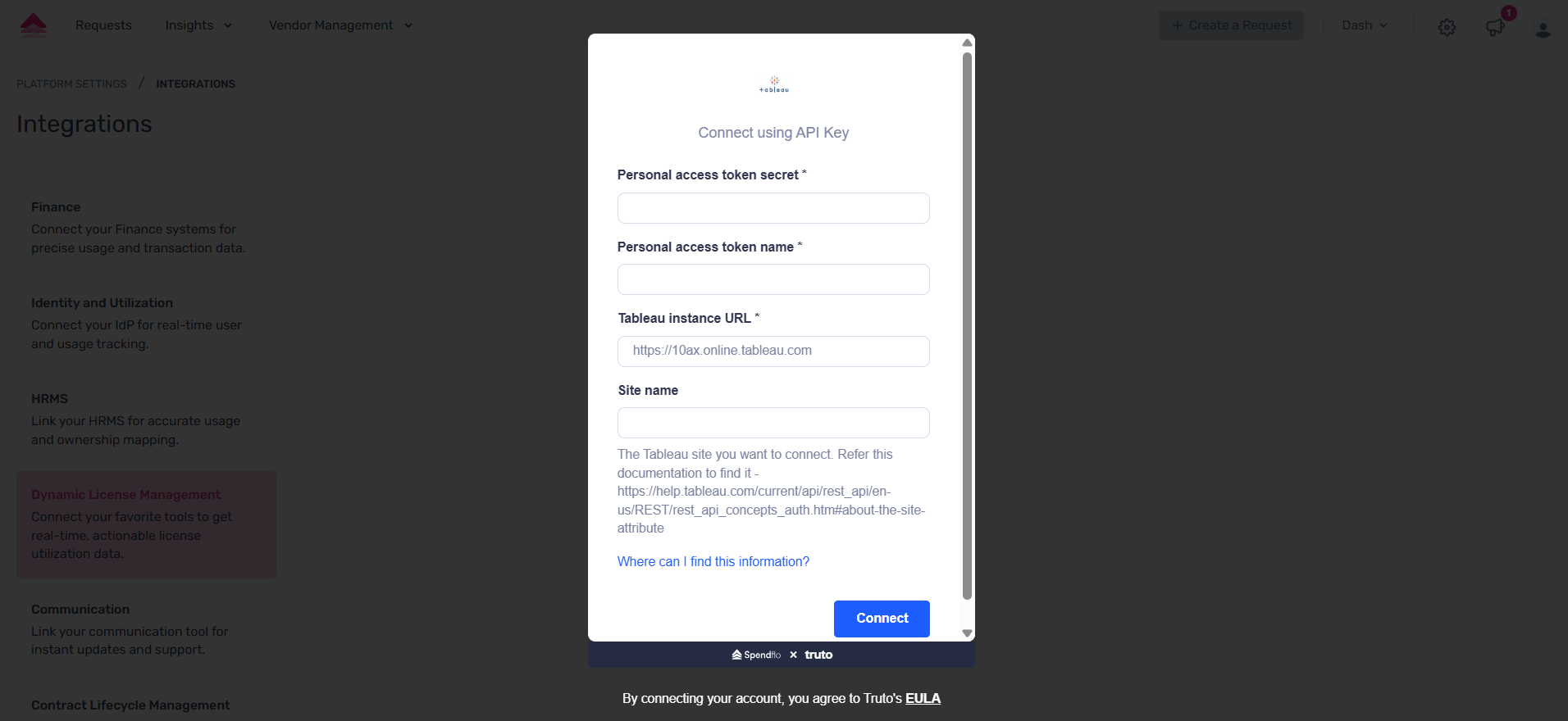 2. Navigate to Tableau under Dynamic License Management and click Connect to start the integration. Ensure you are logged in to your Tableau account. You will be prompted to enter the Personal Access Token Secret, Personal Access Token Name, Tableau Instance URL, and Site Name to complete the setup.