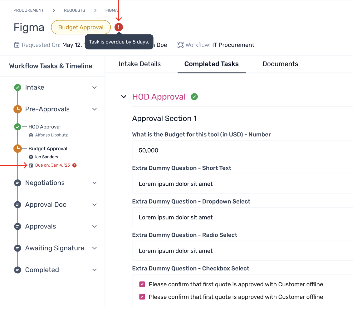 Spendflo gives you two ways to stay on top of your pending and overdue tasks - directly from the Home Screen, or from within a specific request in the Workflow Listing.