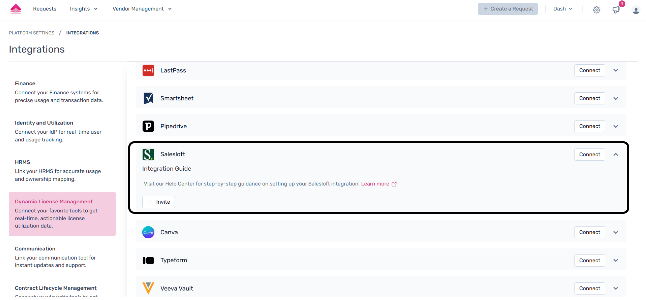 Step 2. Navigate to Salesloft under Dynamic License Management and click Connect; ensure you are logged in to your Salesloft account. If an admin is required to connect, open the accordion and click Invite to invite an admin to complete the connection.