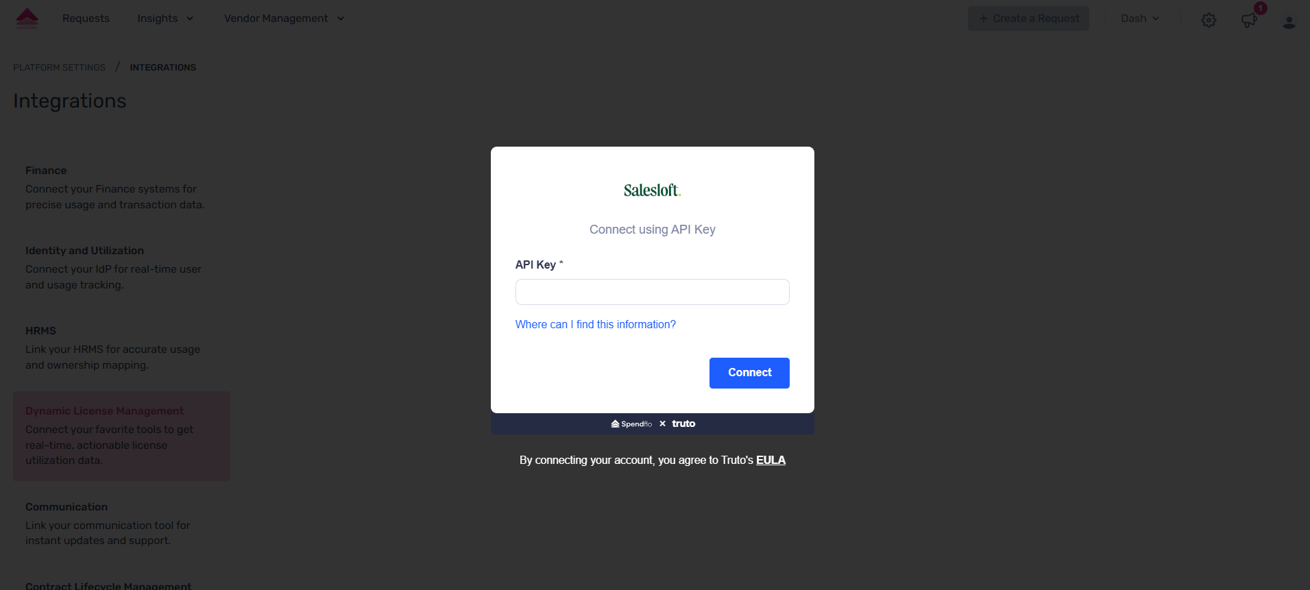 Spendflo's integration with Salesloft streamlines license management by centralizing all licensing data on a single platform. Users can access detailed license information and usage metrics directly within the Spendflo app. This allows for immediate visibility into Salesloft licenses and the capability to manage licensing actions directly through Spendflo, ensuring streamlined operations and enhanced visibility into Dynamic License Management (DLM).