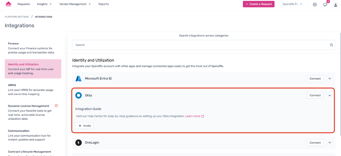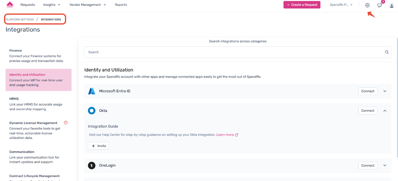 Step 1. Go to the Spendflo Integrations page by navigating to Settings → Platform Settings → Integrations → Identity and Utilization