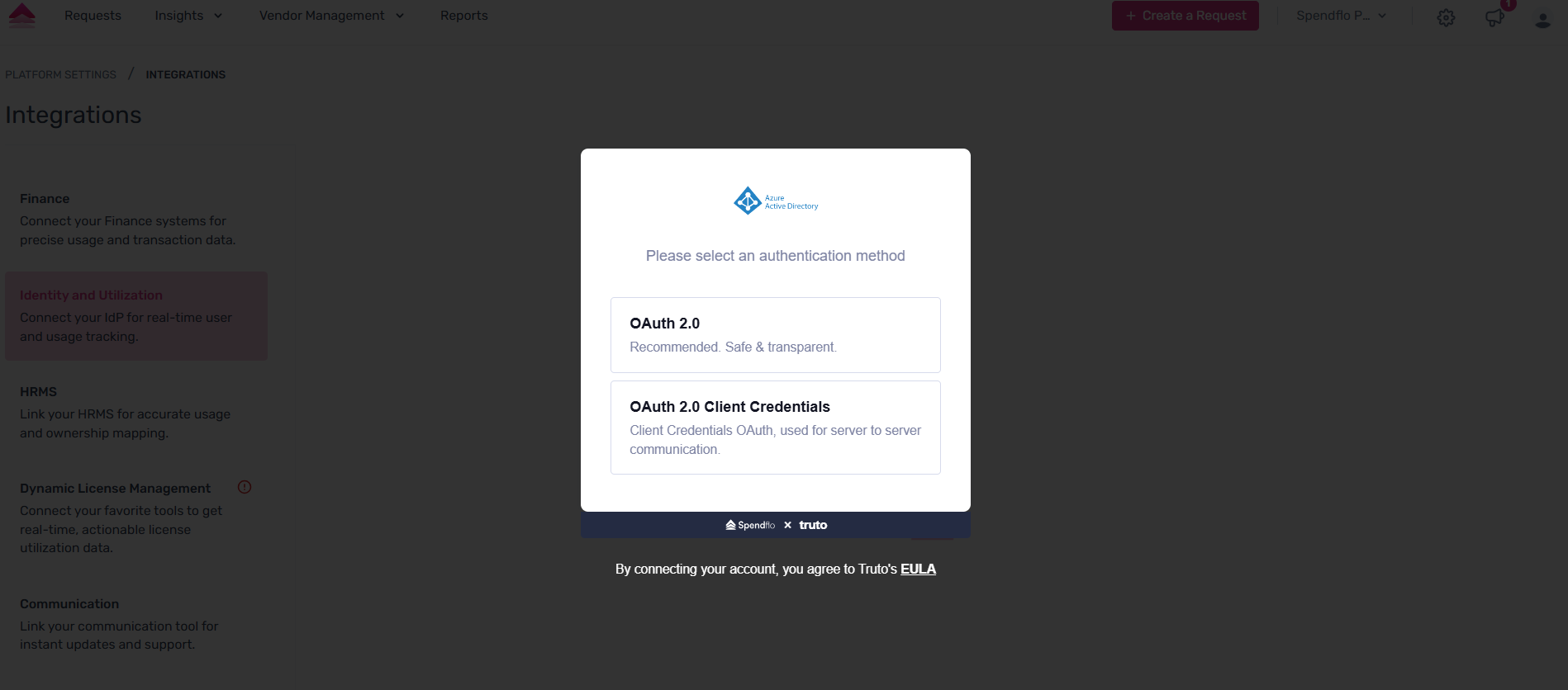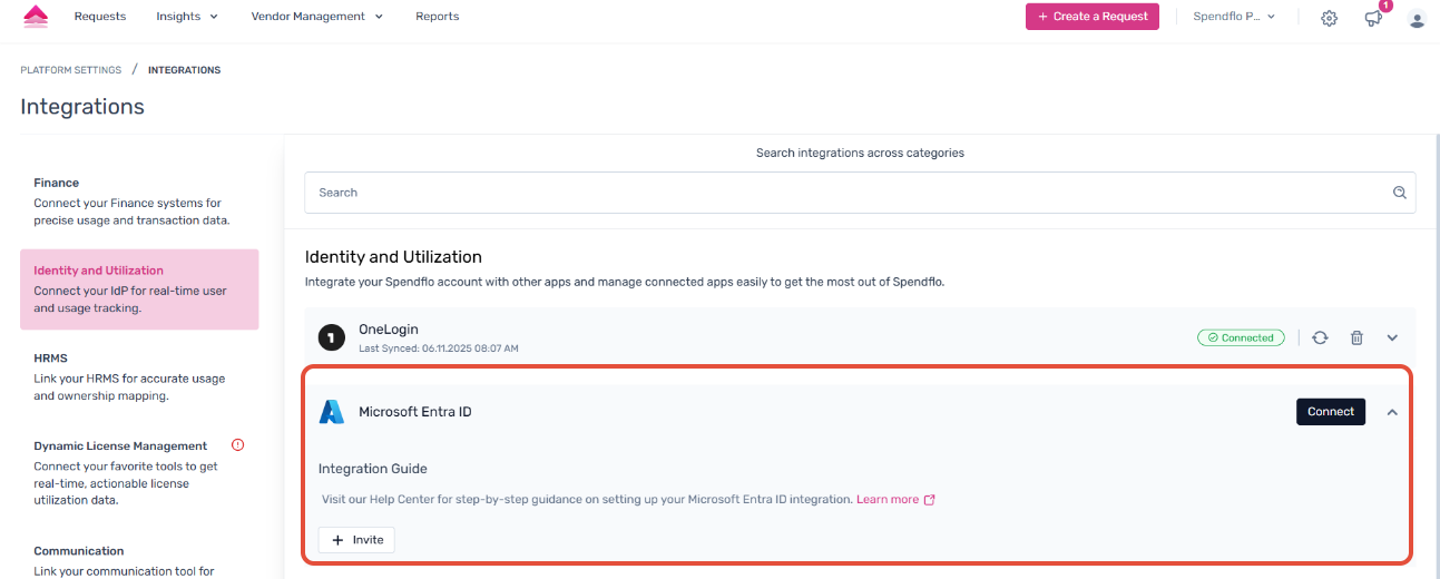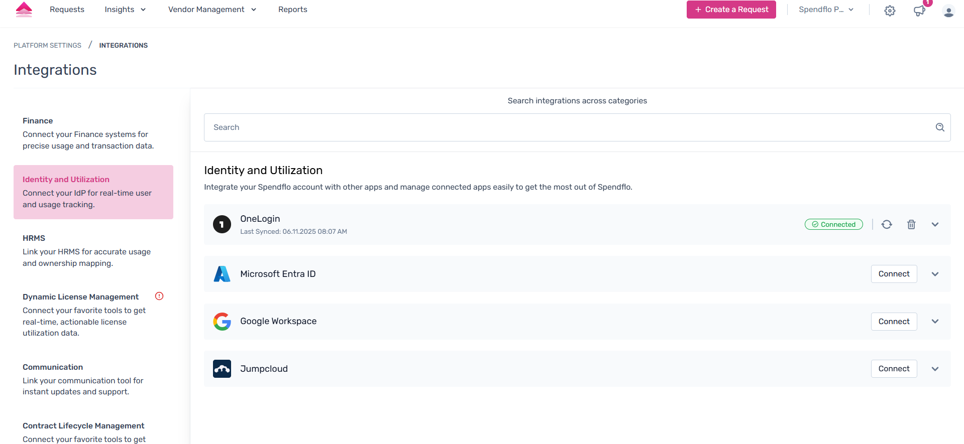 Go to the Spendflo Integrations page by navigating to Settings → Platform Settings → Integrations → Identity and Utilization