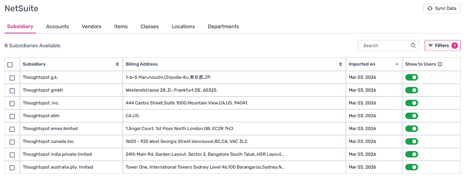 You can view all imported data inside their respective tabs within the NetSuite integration in Spendflo.