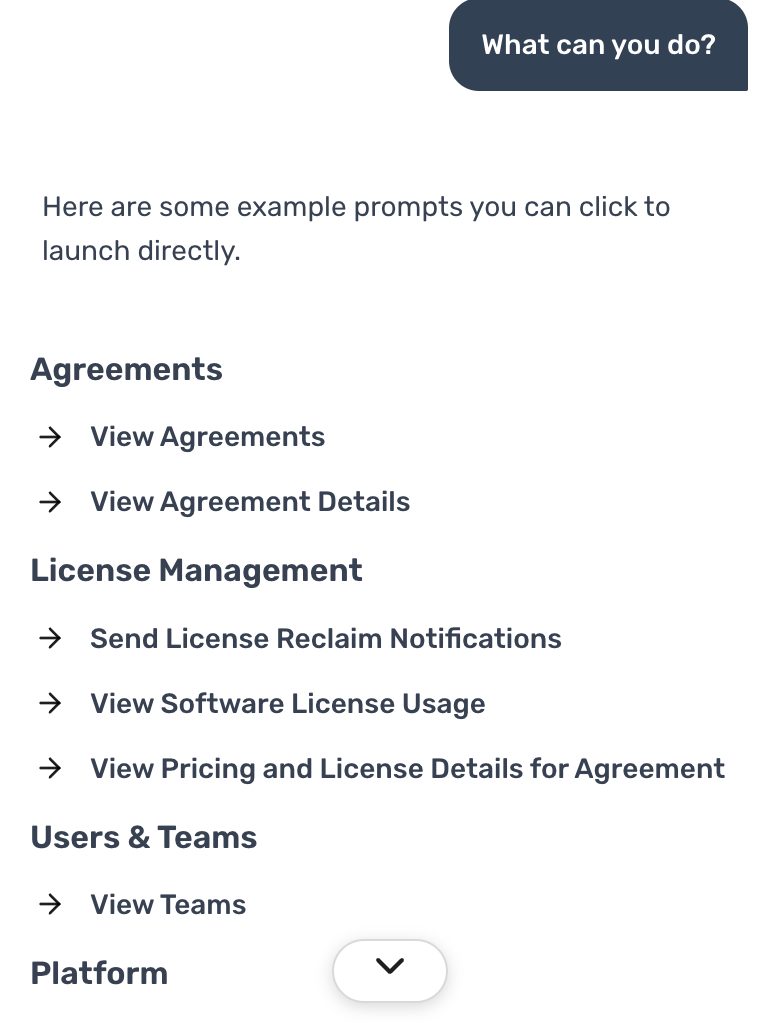 When you open the chatbot, you’ll see a few default prompts along with an option called “What can you do?”. Clicking this shows a complete list of available prompts that you can select to view the corresponding data. These ready-to-use prompts help you get started quickly without typing a full query.