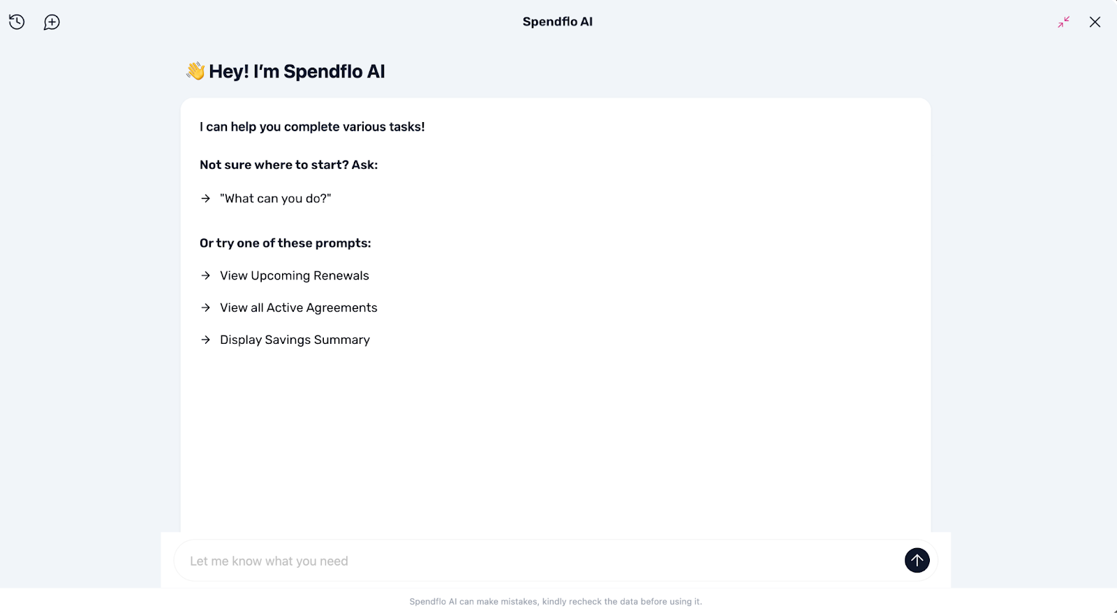 To use Copilot, click the Spendflo AI button at the top left of any screen. A chat window will open at the bottom right, where you can either choose a suggested prompt or type your own to get started.