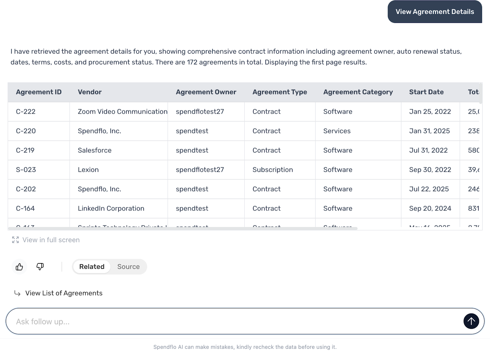 For every response, related prompts appear below to help you continue the conversation or view additional insights while maintaining context. You can also ask Spendflo AI to modify the response as needed.