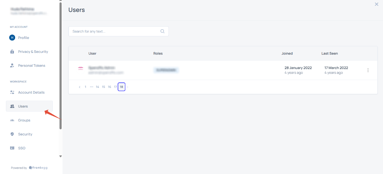 In the left sidebar, click Users under the Workspace section to view all organization users.