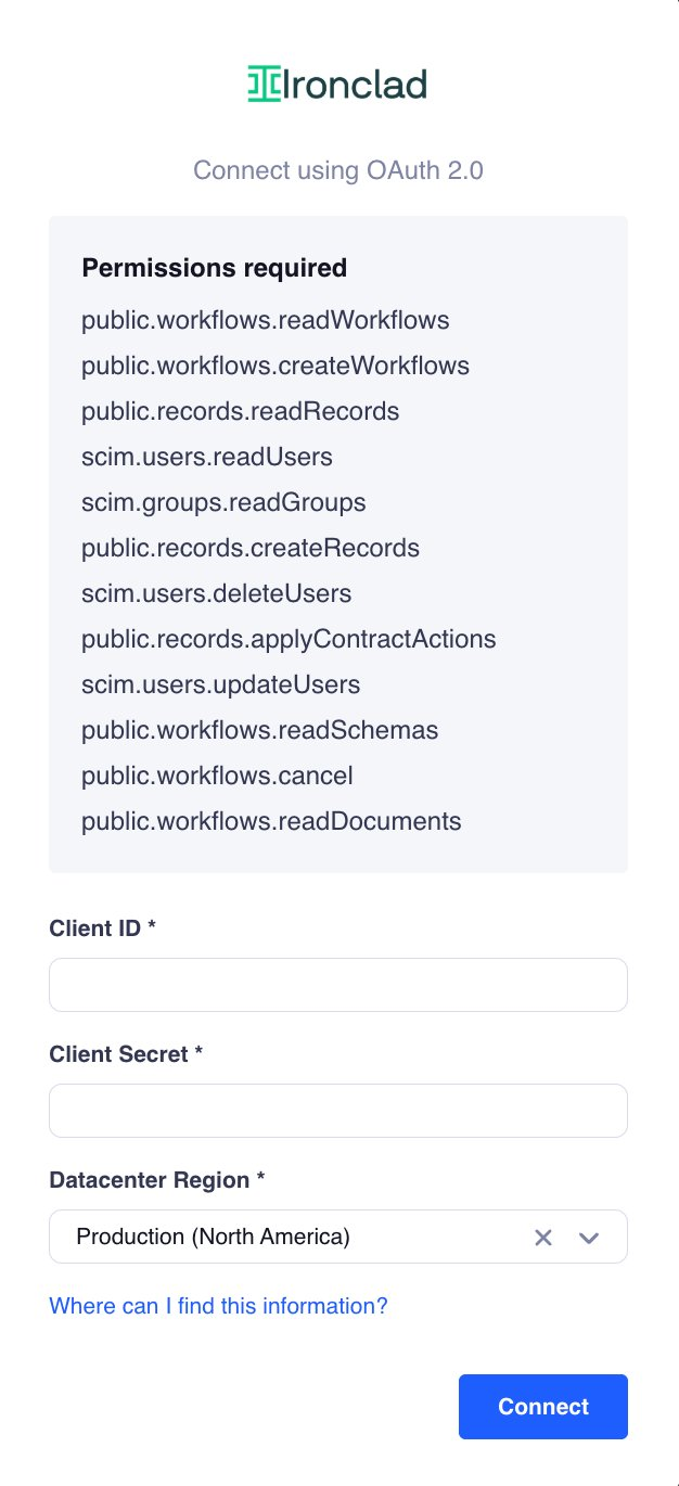 The Ironclad connector modal will open, showing the permissions that will be granted and the fields you need to fill in: