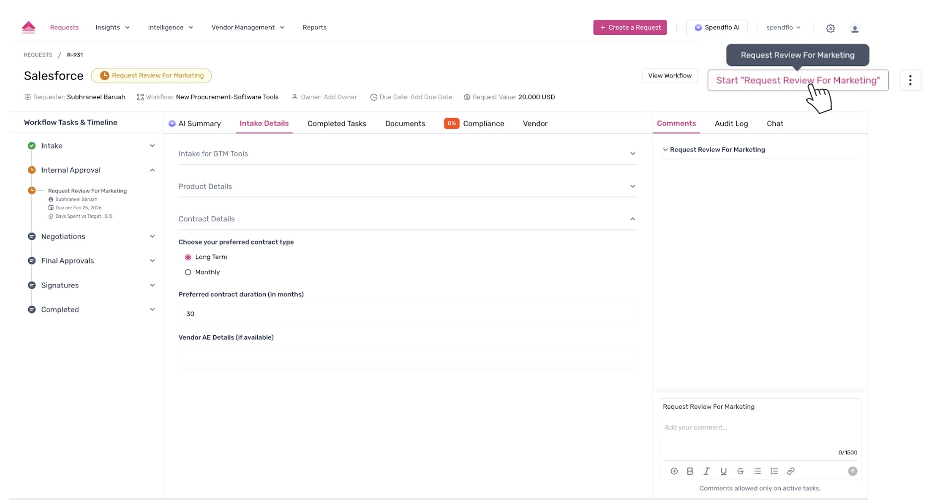 - To move the request to the approval stage, click the Start 'Request Review For Marketing' button. This initiates the approval workflow and notifies the assigned approvers.