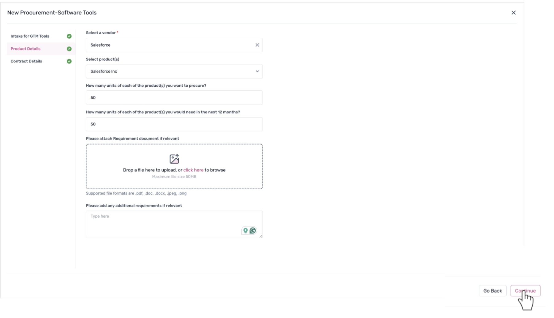 4. On the Product Details screen, provide the necessary vendor and product information: