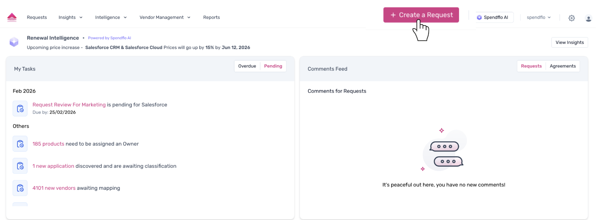 1. From the main Spendflo dashboard, click the + Create a Request button located in the upper right corner of the screen.