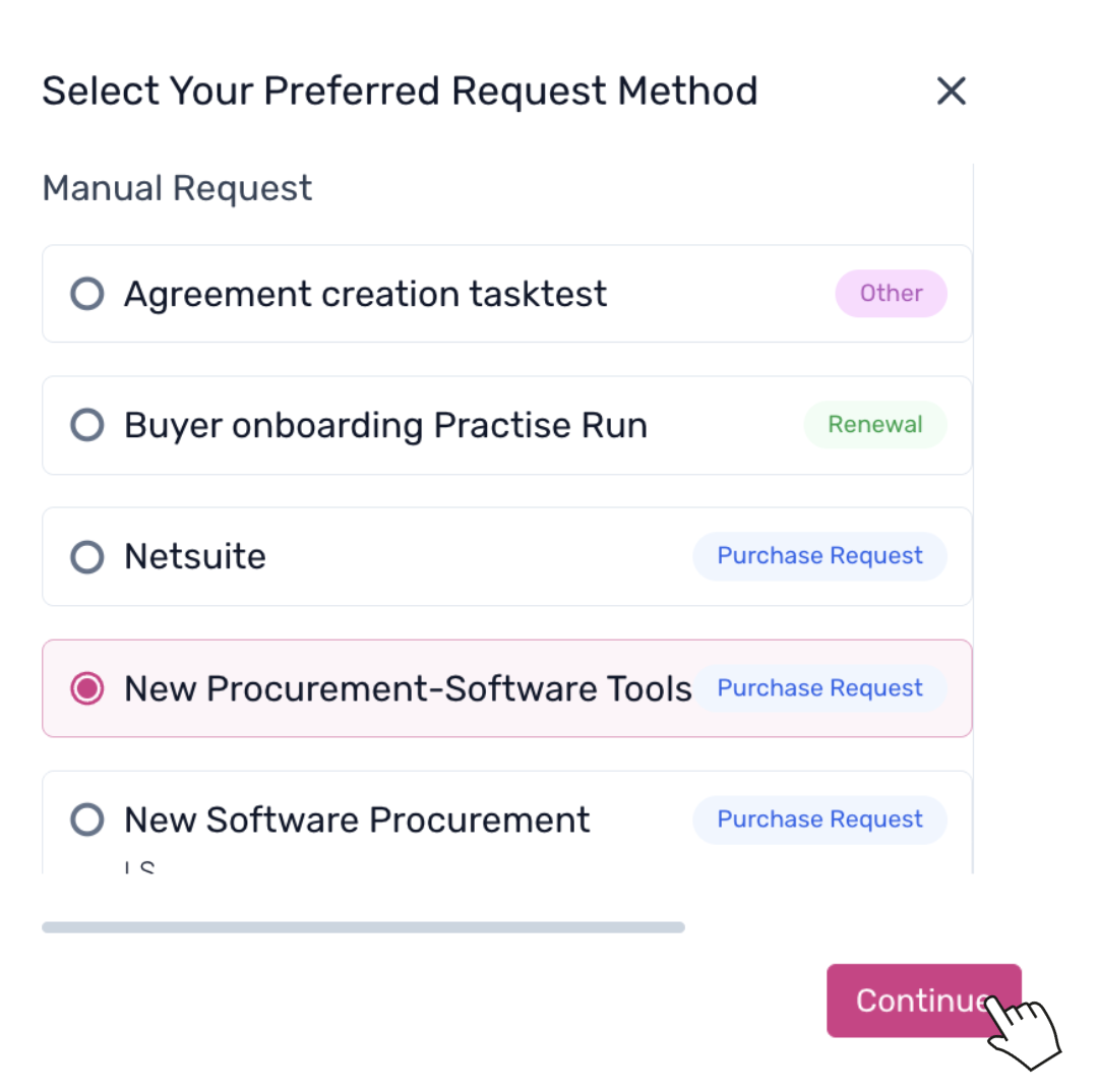 2. A pop-up window will appear displaying different request types. Select New Procurement-Software Tools and click Continue.