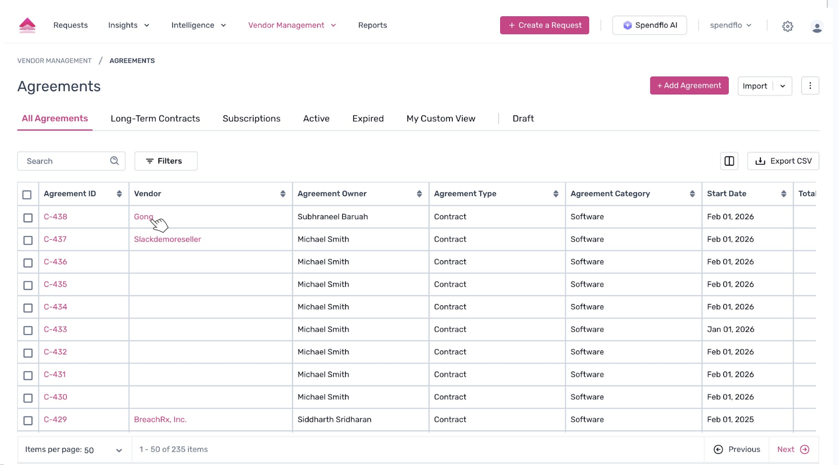 Navigate to the Agreements section by clicking on Vendor Management in the top navigation bar. From the dropdown menu that appears, select Agreements.