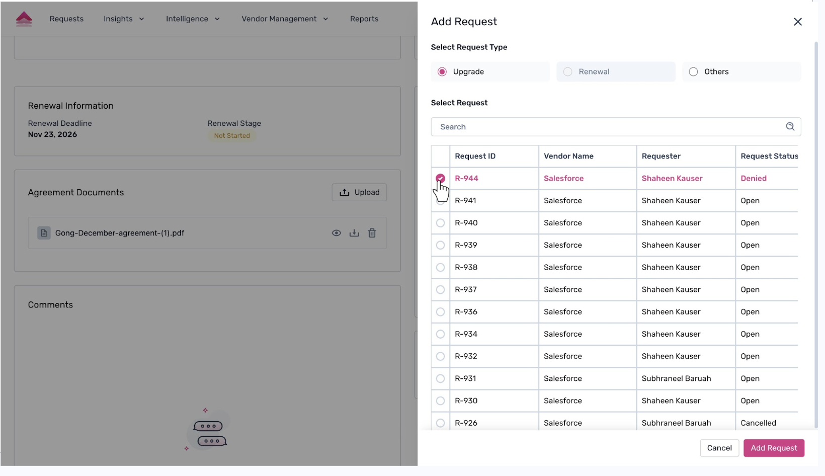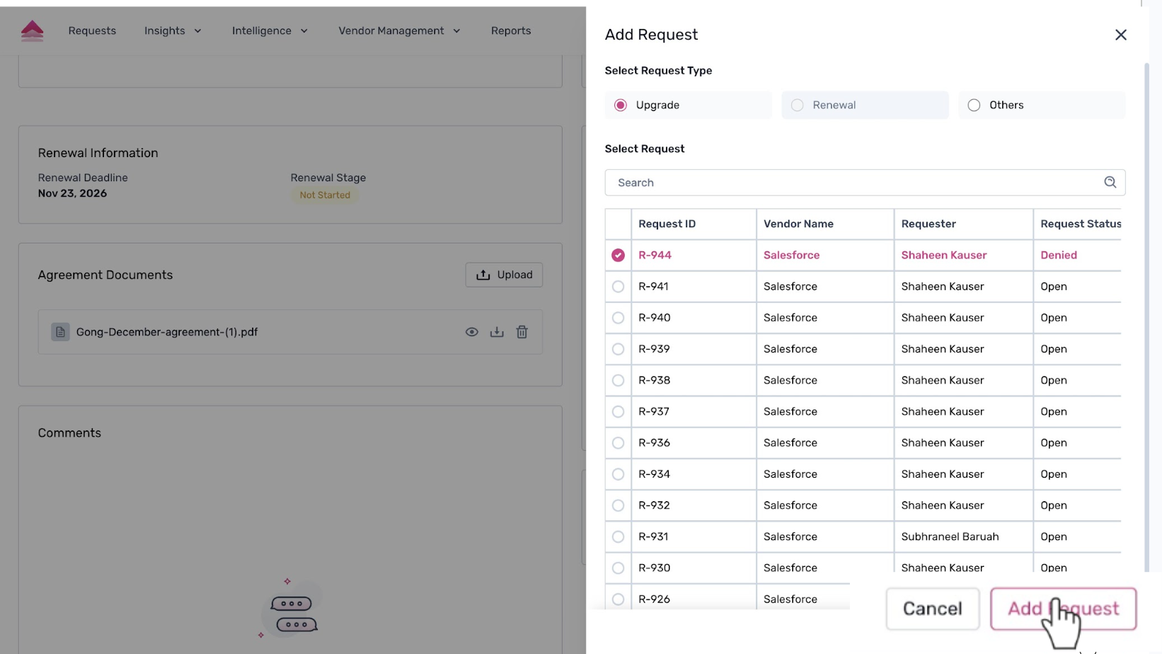 Linking a request to an existing agreement allows you to update renewal stages and ensures that all related procurement activities are tracked within the agreement's lifecycle. This feature enables you to associate upgrades, renewals, or other request types directly with the relevant contract.
