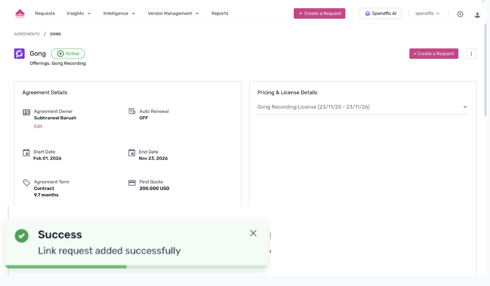 6. The request is now successfully linked to the agreement. A confirmation message will appear on the screen, and the newly linked request will be visible under the Linked Requests section.