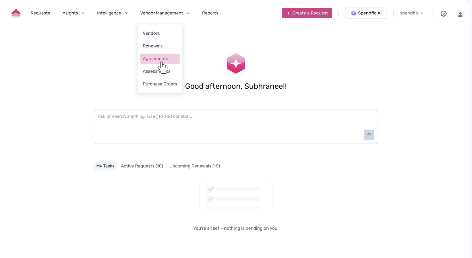 Navigate to the Vendor Management tab in the main header and select Agreements from the dropdown menu.