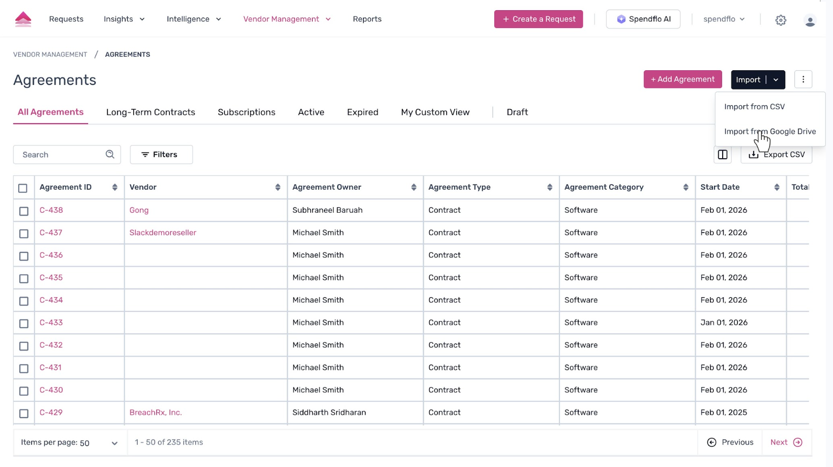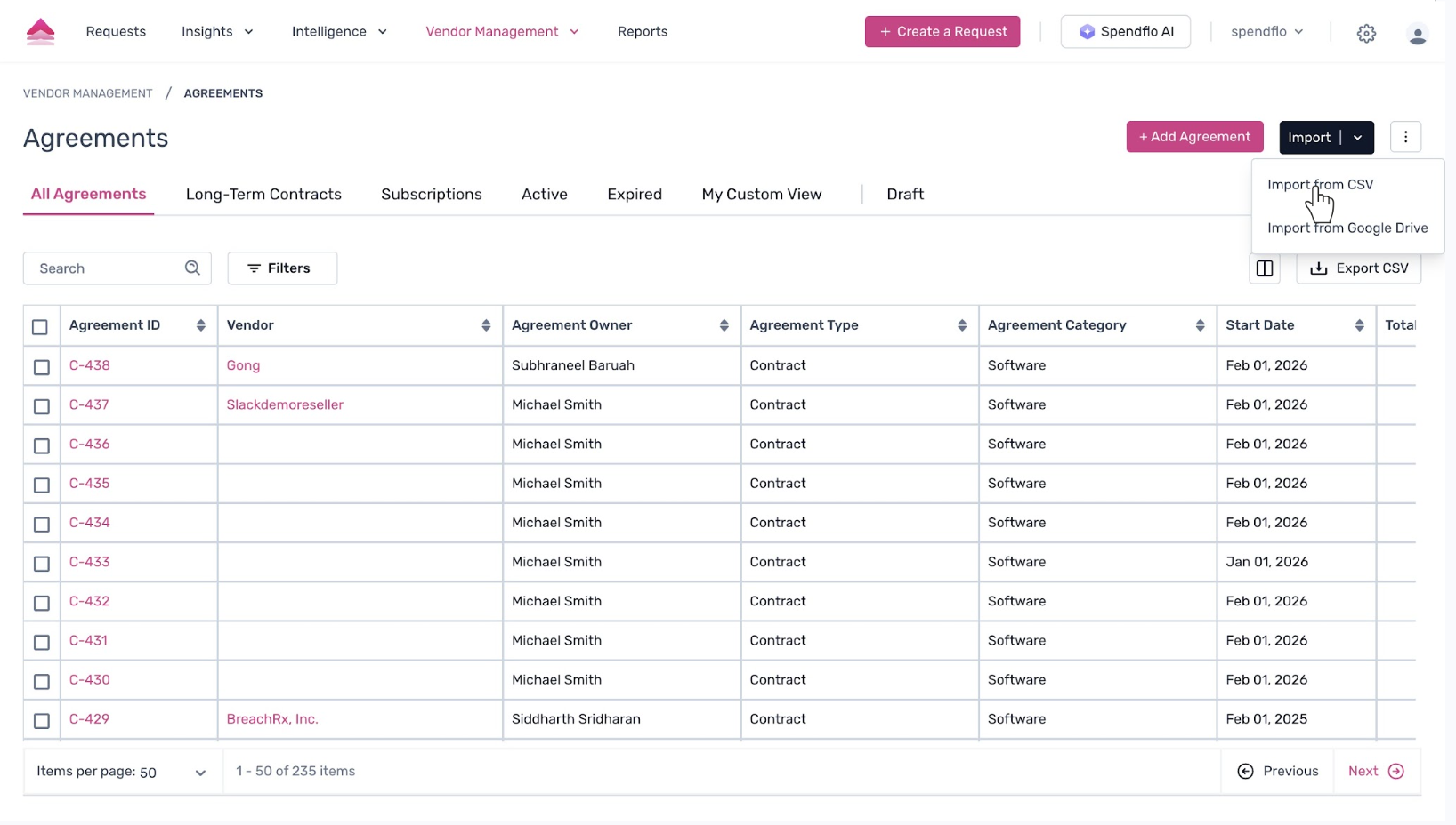Spendflo enables users to bulk upload agreements efficiently using a CSV file or by linking a Google Drive folder. This feature streamlines the process of adding multiple contracts, allowing you to collate agreements into a single CSV for direct import or automatically pull them from a drive link.
