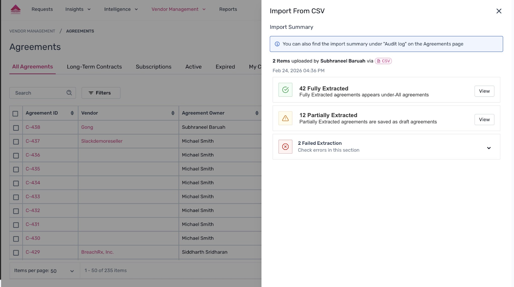 After the file is processed, an Import Summary will be displayed. This summary breaks down the results, indicating how many agreements were fully extracted, partially extracted, or failed.