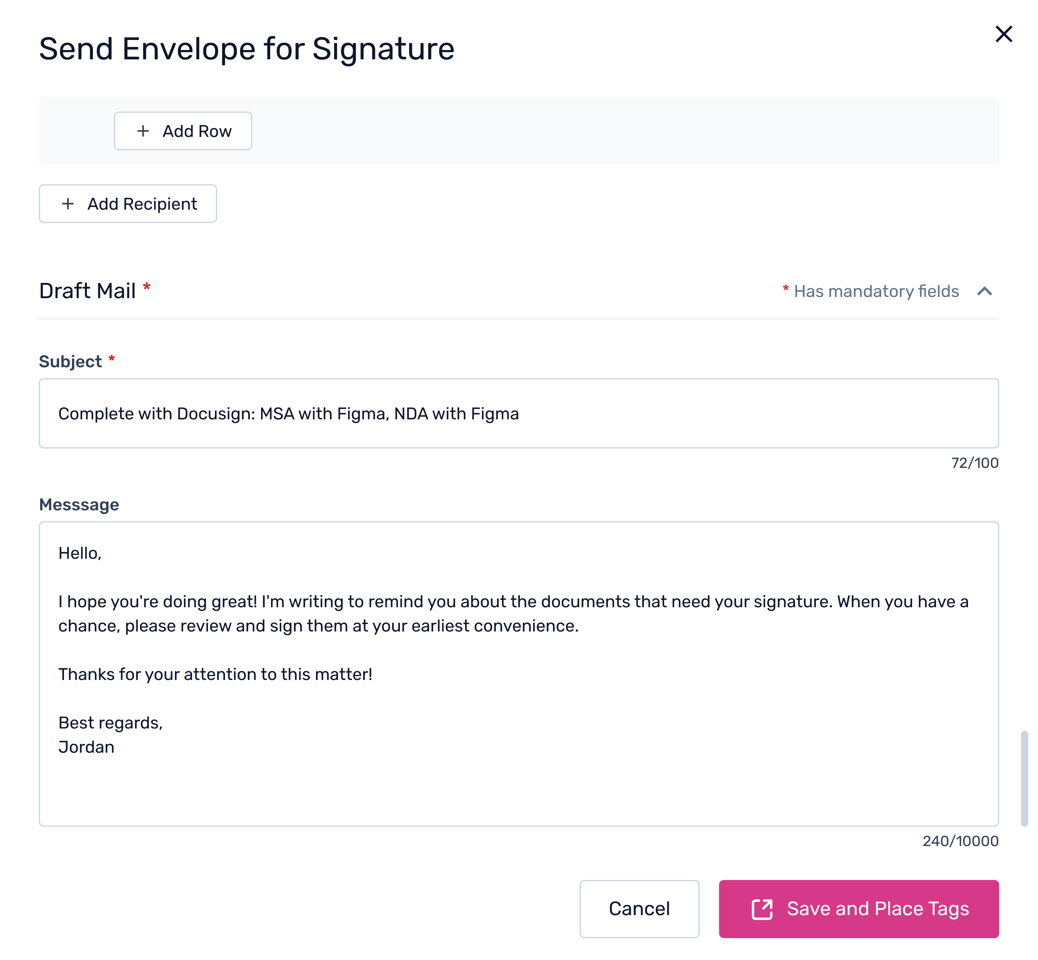 After adding recipients, you’ll see the Draft Mail section. Once the email content is finalized, click Save and Place Tags.