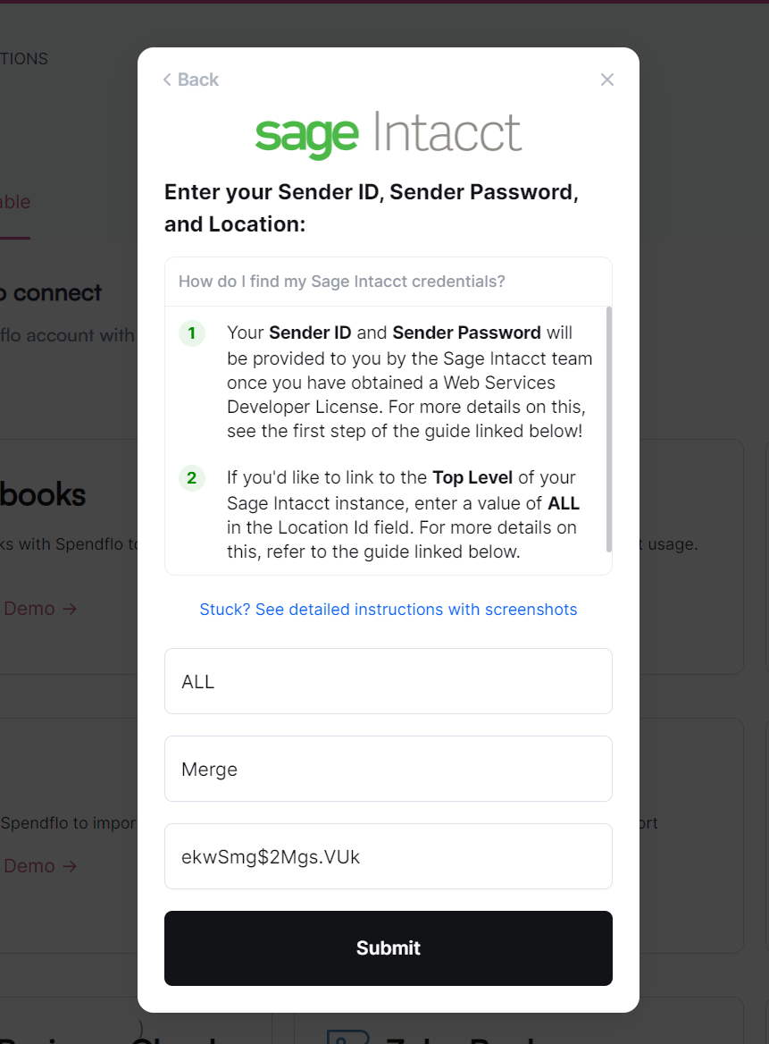 Once you have your Web Services User ID and password ready, follow these steps to connect Sage Intacct in Spendflo.