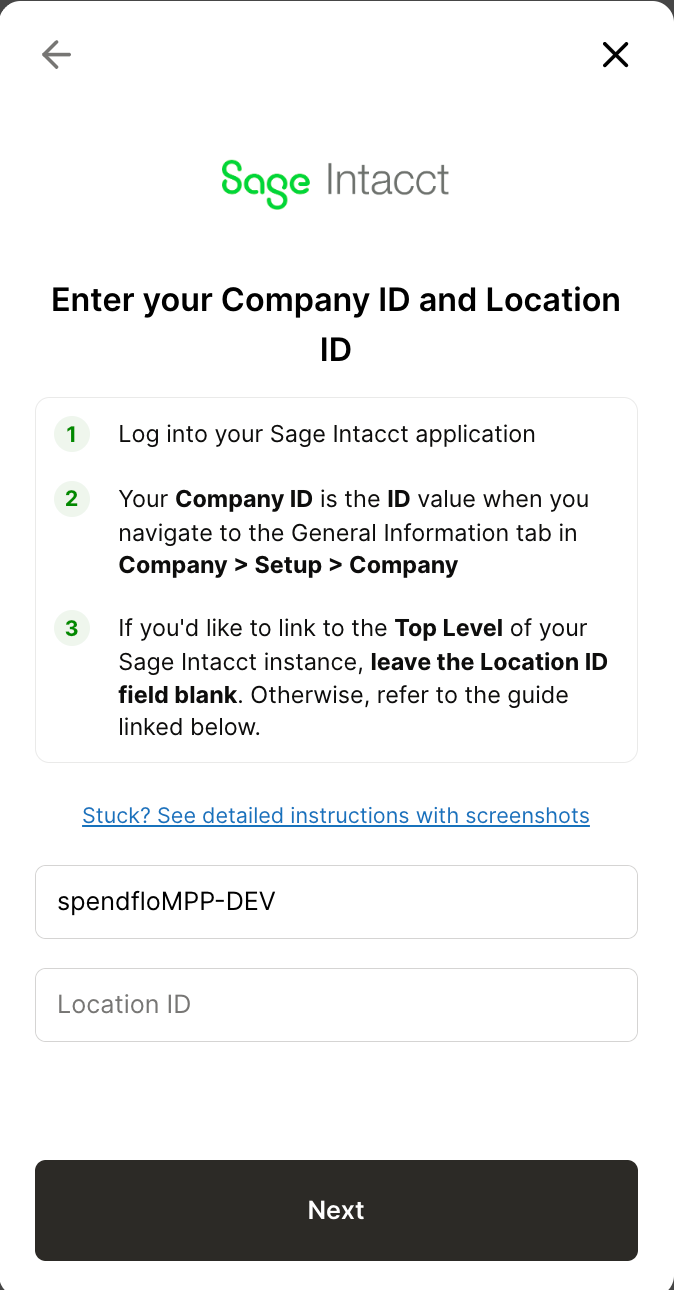 Click Next. Spendflo will validate your credentials and connect to your Sage Intacct account.