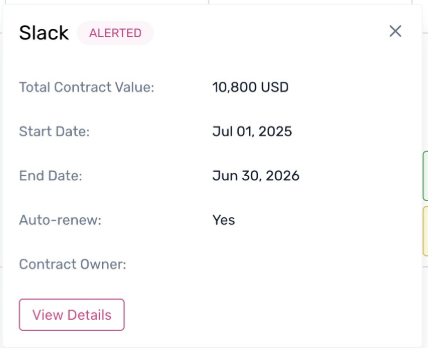 In the calendar view, you can click on any specific renewal event (for example, the Slack renewal) to open a popover that displays a quick summary of the contract, including value, dates, and auto-renew status.